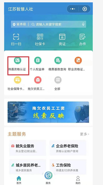 2、打開“江蘇智慧人社”,首頁點擊“待遇資格認證”: